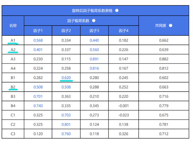 A1~A4这4项,它们全部对应着因子3时,因子载荷系数值均高于0.4,说明此4项应该同属于一个维度,即逻辑上A1~A4这4项,并没有出现‘张冠李戴’现象。但是A1和A2这两项出现‘纠缠不清’现象,A1和A2除了可以对应因子3,也可以放在因子1下面。一般出现‘纠缠不清’现象时,暂时保留,先处理清楚‘张冠李戴’问题更好。