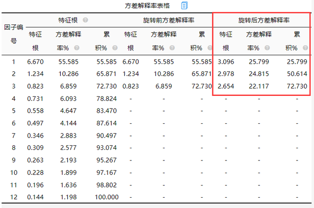 方差解释率越大说明因子包含原数据信息的越多。因子分析中,主要关注旋转后的数据部分。由上图可以显示12个指标中,第一个因子的方差解释率为25.799%,是由特征根3.096/12(指标个数)得到的。第二个因子的方差解释率为24.815%,第三个因子的方差解释率为22.117%,累积方差解释率由三者相加为72.730%,累积方差解释率这个值没有固定标准,一般超过60%都可以接受。特征根对于因子的提取有什么作用,以下展开来说。