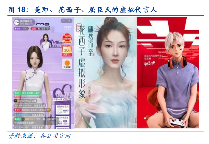 2)成本较低、便于迭代:对企业而言,虚拟人的技术成熟后即可规模化复制,其成本主要 以开发运营的员工成本为主。且虚拟人的生命周期较长,可不断迭代,进行 IP 化运营。虚 拟人形成规模效应后,其边际成本递减,毛利率较高。 3)高效触达用户:品牌通过虚拟人进行立体化宣传,将品牌符号人格化,能够强化统一消 费者对品牌的认知。借助 AI 技术及大量运营人员沉淀专属私域流量,使得虚拟人能够高频 次、随时随地触达消费人群,尤其更能吸引 Z 世代。