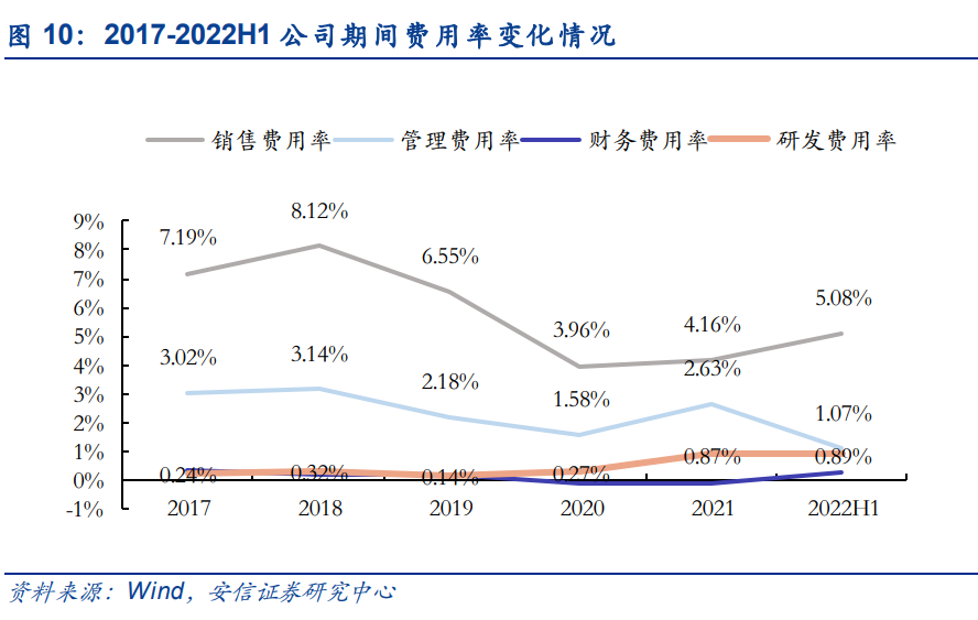 随业务规模扩大,期间费用率整体呈下降趋势。公司期间费用支出随着业务规模的扩大而呈 现持续增长态势,而三费增速不及营收增速,使得费用率整体呈下行趋势。其中,销售费用 率由 2018 年的 8.12%降至 2020 年的 3.96%,管理费用率由 2018 年的 3.14%降至 2020 年 的 1.58%,公司规模优势及控费能力不断体现。而 2021 年销售费用率及管理费用率有所回 升,主要系公司大力拓展市场,人员增加的同时本年不再享受社保减免所致,总体变化不大。