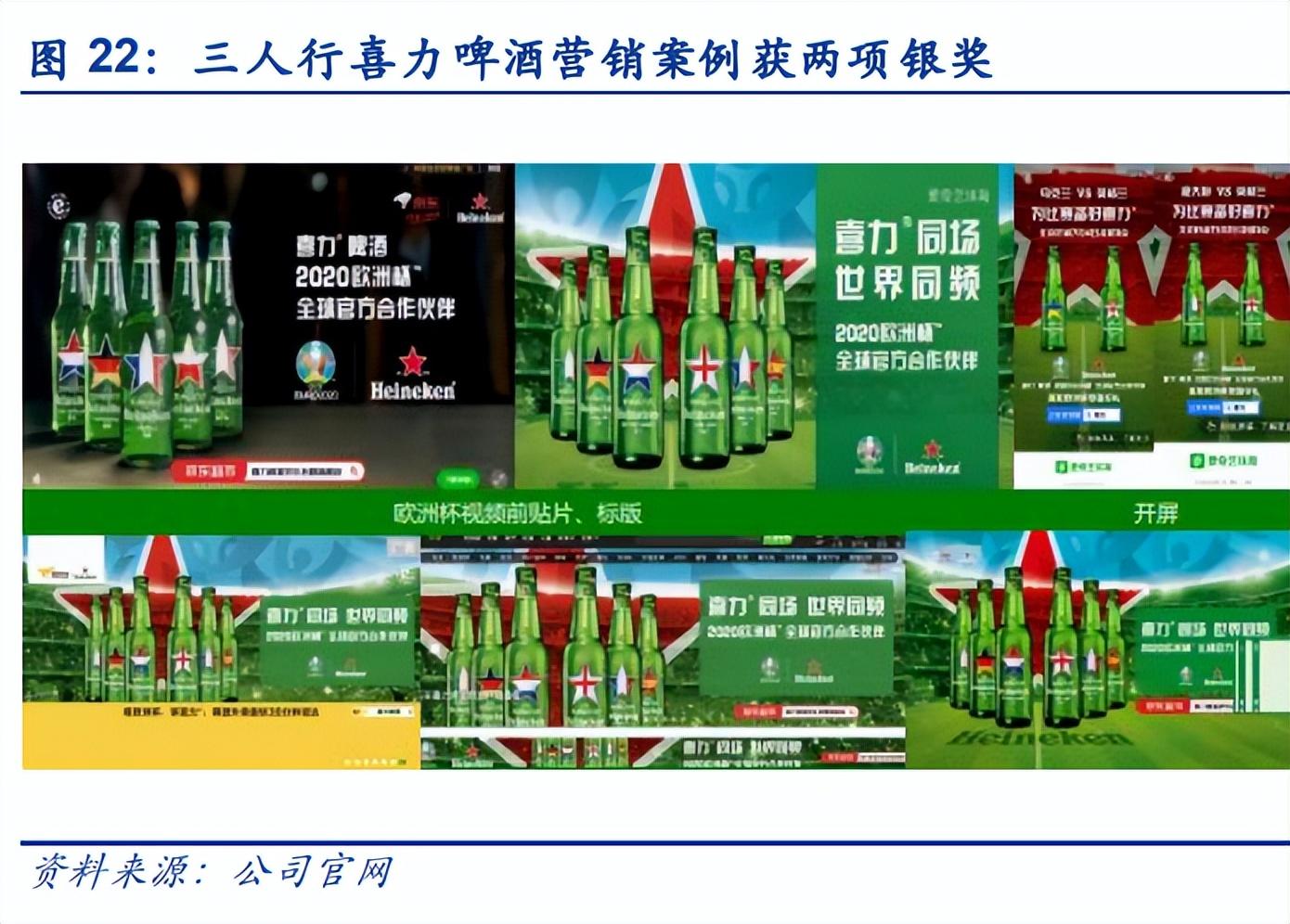 各业务部门有效协同,整合营销能力突出。专业人才团队在洞察客户品牌的市场定位、发掘 客户产品或服务的营销亮点的基础上,能够融合公司在数字营销、场景活动及校园媒体营销 等业务领域的布局,整合媒体与场景、线上与线下等营销信息传播渠道,为客户提供全流程 的整合营销服务,形成了具有特色的整合营销服务能力。例如,2021 年公司体育营销项目 通过喜力啤酒借势欧洲杯赛事 IP 影响力,在线上各大平台突出品牌身份,同时在线下生活 圈、出行及户外媒体进行覆盖,进行线上线下深度扩散,最终实现品牌影响力及销量的双重 增长,并获得第 28 届中国国际广告节互动创意奖&媒介营销奖两项银奖。