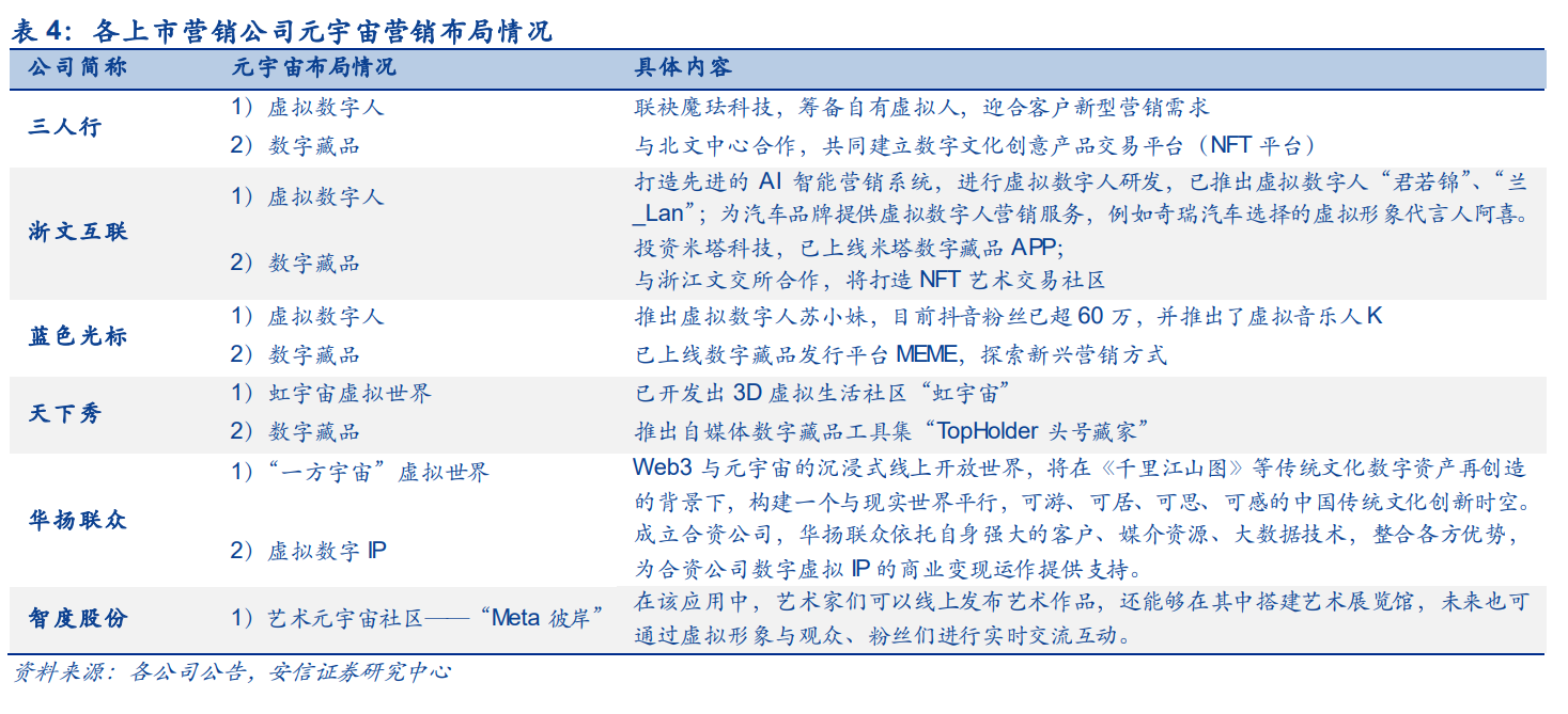2021 年元宇宙概念的火热催生了营销新需求,以虚拟人及数字藏品为代表的元宇宙营销模 式备受关注。元宇宙的发展使得消费者与企业互动方式发生转变,为企业创新营销方式带来 了新的机遇。与现有的传统营销方式相比,元宇宙营销具有更高的集成性、更高的品牌自由 度、更灵活的营销形式、更亲密的品牌与消费者关系等优势。大量数字营销公司积极拓宽元 宇宙领域业务,包括三人行、浙文互联、蓝色光标、天下秀、华扬联众等众多数字营销企业 在元宇宙上展开了布局。