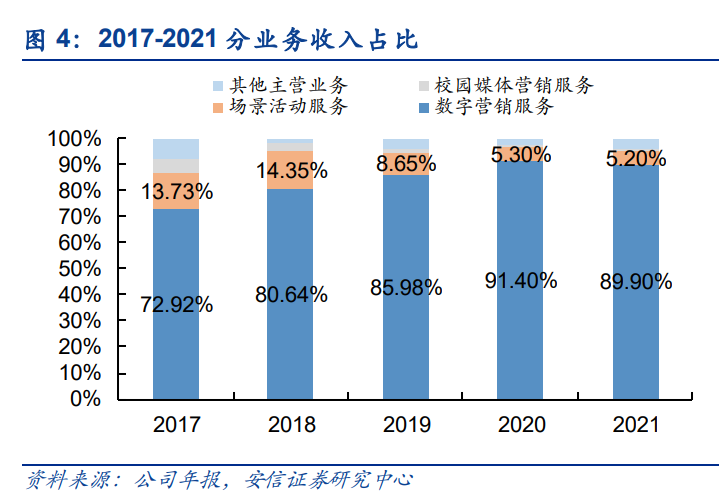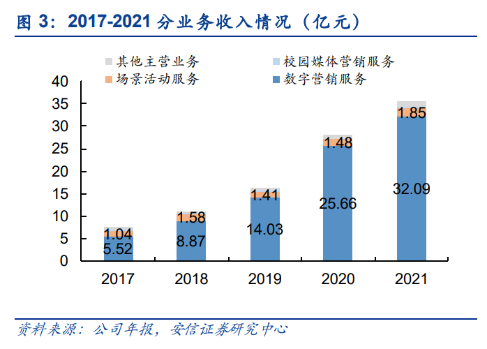 数字营销服务是公司业绩增长核心驱动力。自 2014 年公司转型互联网数字营销领域以来, 行业发展大趋势下,其数字营销服务业务收入快速增长,逐渐成为公司的核心收入来源。2021 年,数字营销服务、场景活动服务、校园媒体营销服务分别占主营业务收入的 89.9%、5.2%、 0.8%。其中,数字营销服务的收入自 2017 年的 5.52 亿元增长至 2021 年的 32.09 亿元,年 均复合增长率为 55.28%,营收占比也从 2017 年的 72.92%上升至 2021 年的 89.9%,是公 司最为核心的业务。数字营销服务分为广告投放代理及广告方案策划与执行,2021 年前者 收入为 31.31 亿元,后者收入为 0.78 亿元。因此,公司主要作为代理中介为客户提供媒介 采买服务。