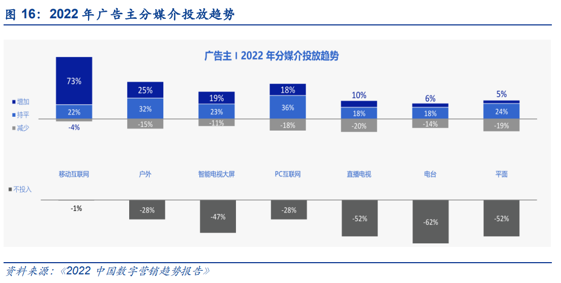 随着互联网媒体成为主流媒体形式,广告主逐步加大数字营销投入。根据微播易联合胖鲸发 布的《2022 主流社交媒体平台趋势洞察报告》,微信活跃用户突破 12 亿、抖音活跃用户超 过 7 亿,小红书用户量超过 4 亿,直播带货、短视频种草等方式兴起,促使更多品牌主将重 金广告费投向互联网广告领域,近年来大幅提升数字营销预算。根据《2022 中国数字营销 趋势报告》,各广告主数字营销的投入占市场预算的 50.1%,2022 年,83%的广告主将增加 数字营销投入,且移动互联网仍是广告主最愿意增加投资的营销资源类型。