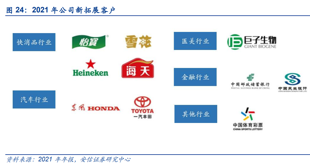 2021 年,公司新增金融、快消、汽车等行业头部企业新客户,并拓宽医美、体彩行业客户。 金融方面,新增邮储银行、民生银行等金融行业头部优质客户;快消品方面,新增华润集团 旗下怡宝、雪花、喜力、海天味业等客户;新增医美行业头部企业巨子生物等新消费客户; 新增国家体育总局体育彩票管理中心客户,为体彩中心提供彩票票面创意设计及在互联网音 频等媒体上进行广告投放。 公司大力落实开拓汽车行业整合营销业务的发展战略。根据公司 2021 年年报,公司新中标 东风本田 2022 年度网络广告投放代理项目,同时也中选为一汽丰田全新车型提供品牌宣传 和传播等营销服务,将进一步积攒汽车行业营销经验。目前,公司服务的汽车品牌包括:一 汽大众、东风本田、一汽丰田、别克等,后续有望持续开拓汽车行业客户,增强企业竞争力。