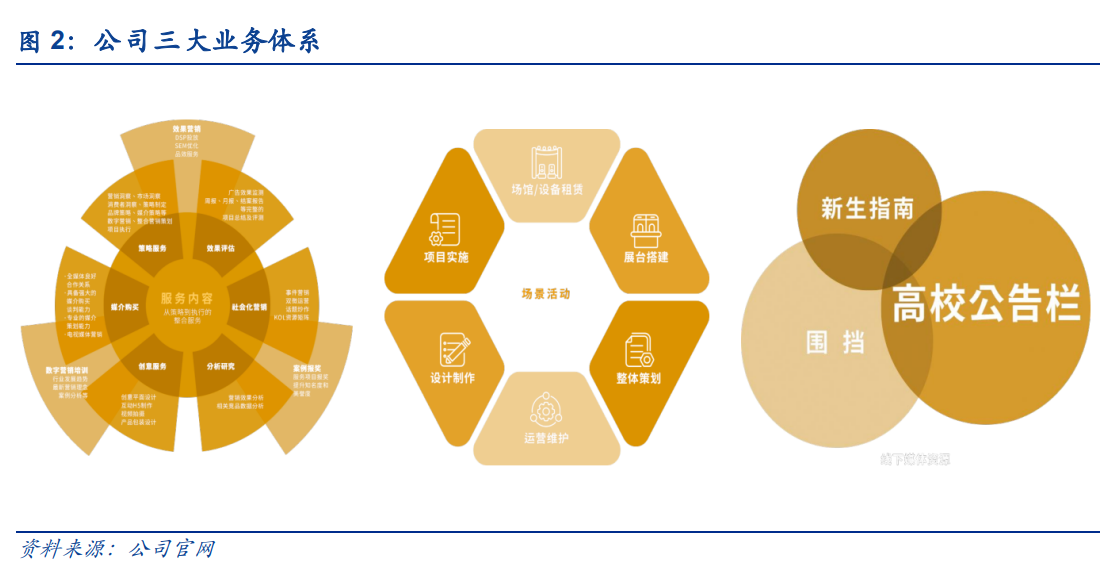 公司是专业从事整合营销服务的综合性广告传媒企业,现任中国 4A 理事单位、中国广告协 会副会长单位。作为国内领先的整合营销服务供应商,为客户在全案数字营销、场景活动、 校园整合营销等领域提供全方位、全流程的营销策划、执行与传播服务,通过多种媒介方式 满足客户多场景、高曝光、全覆盖、富有创意的营销传播需求。 由校园场景营销顺势转型数字营销,成功于上交所上市。公司发展主要分为两大阶段,2003 年从高校媒体营销起家,2014 年转型移动互联网营销领域,逐步成长为国内领先的整合营 销服务供应商。2020 年 5 月 28 日公司于上交所上市,正式登陆资本市场。