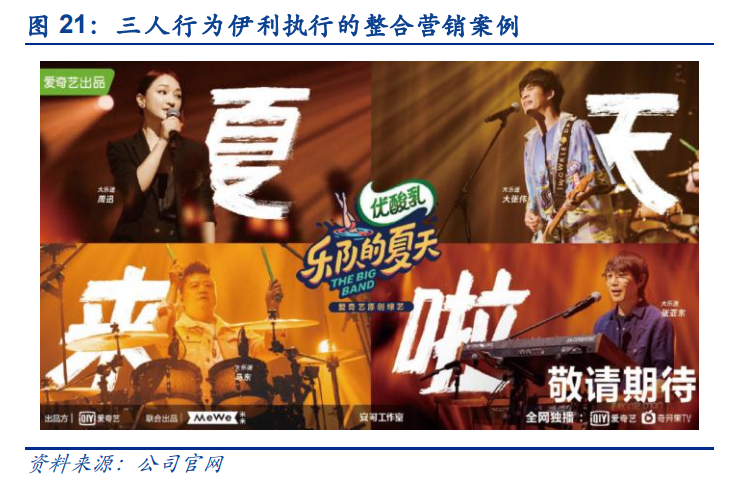为提高公司的整合营销能力,公司文化鼓励跨部门合作创新、并针对大客户组建单独的服务 团队,以用户营销结果为导向。例如,公司为伊利建立了整建制、专业化的服务团队,深刻 理解伊利液奶、冰品、奶粉等不同产品线产品的品牌调性和营销特点,已为伊利整合执行了 若干具有市场顶级影响力的大项目,如《乐队的夏天》、《吐槽大会》、《乘风破浪的姐姐》等。