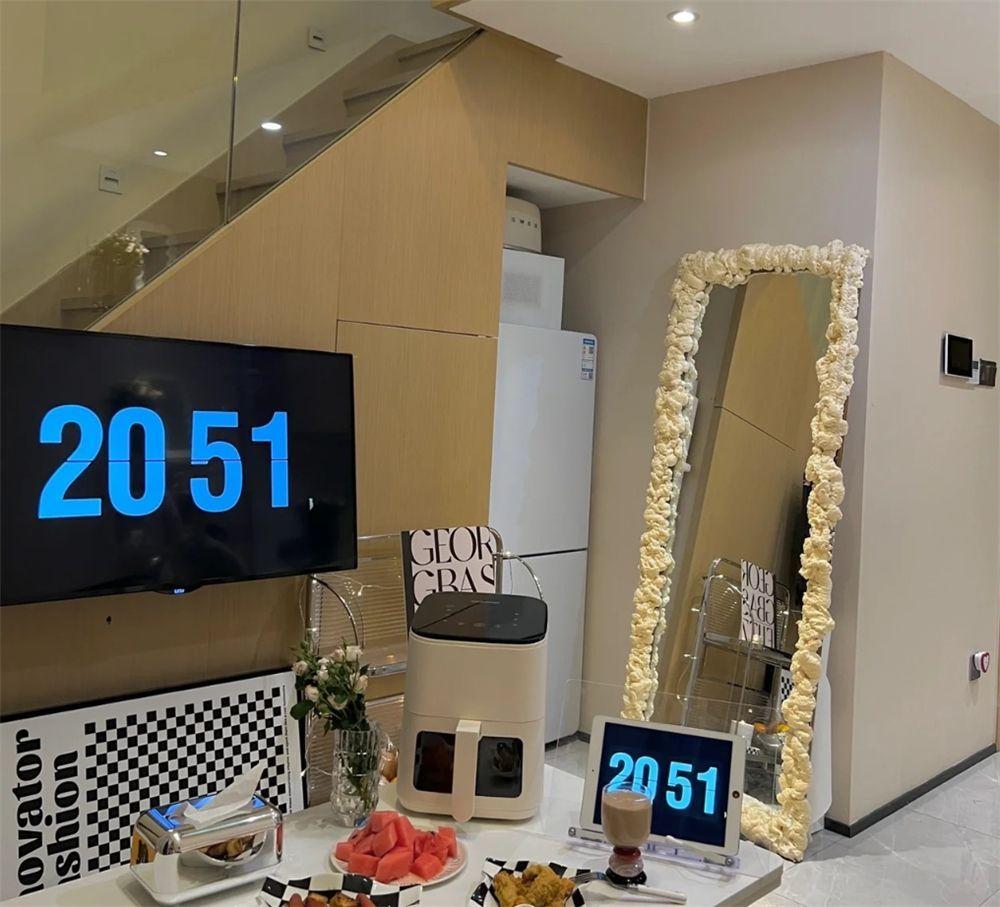 利用楼梯间侧边和下方区域,这位姑娘嵌入了收纳柜和冰箱,并靠墙摆放一面等身镜,填补了空白区域,既显得满满当当地很有生活气息,又颇具少女风氛围。