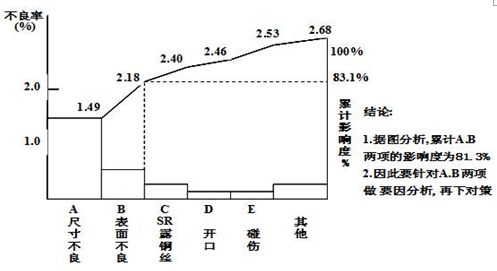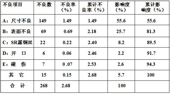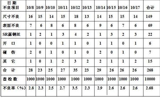 这个案例首先是一个研究理由,然后改善目标然后、现状把握,这个在QC手法里面叫做查检表,就是把记录记下来,什么尺寸不良、表面不良、碰伤、其他等等,然后把不良率统计出来,有了不良率就做柏拉图分析。