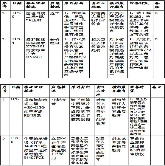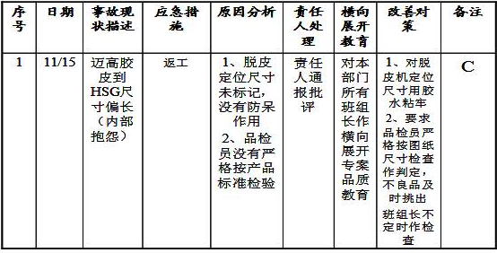 这是其中的一个记录,每一个问题都用这个方法记录,并一直延下来。重复问题也可以找到,如果第二次发生了,就在后面备注。把碰到的所有问题都作好记录,记录里有分析,也有采取措施,这样PDCA就顺在里面。
