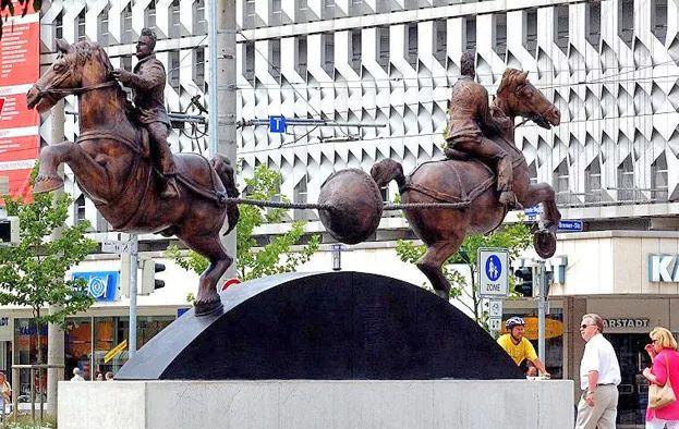 格里克和助手当众把两个黄铜半球中间垫上橡皮圈