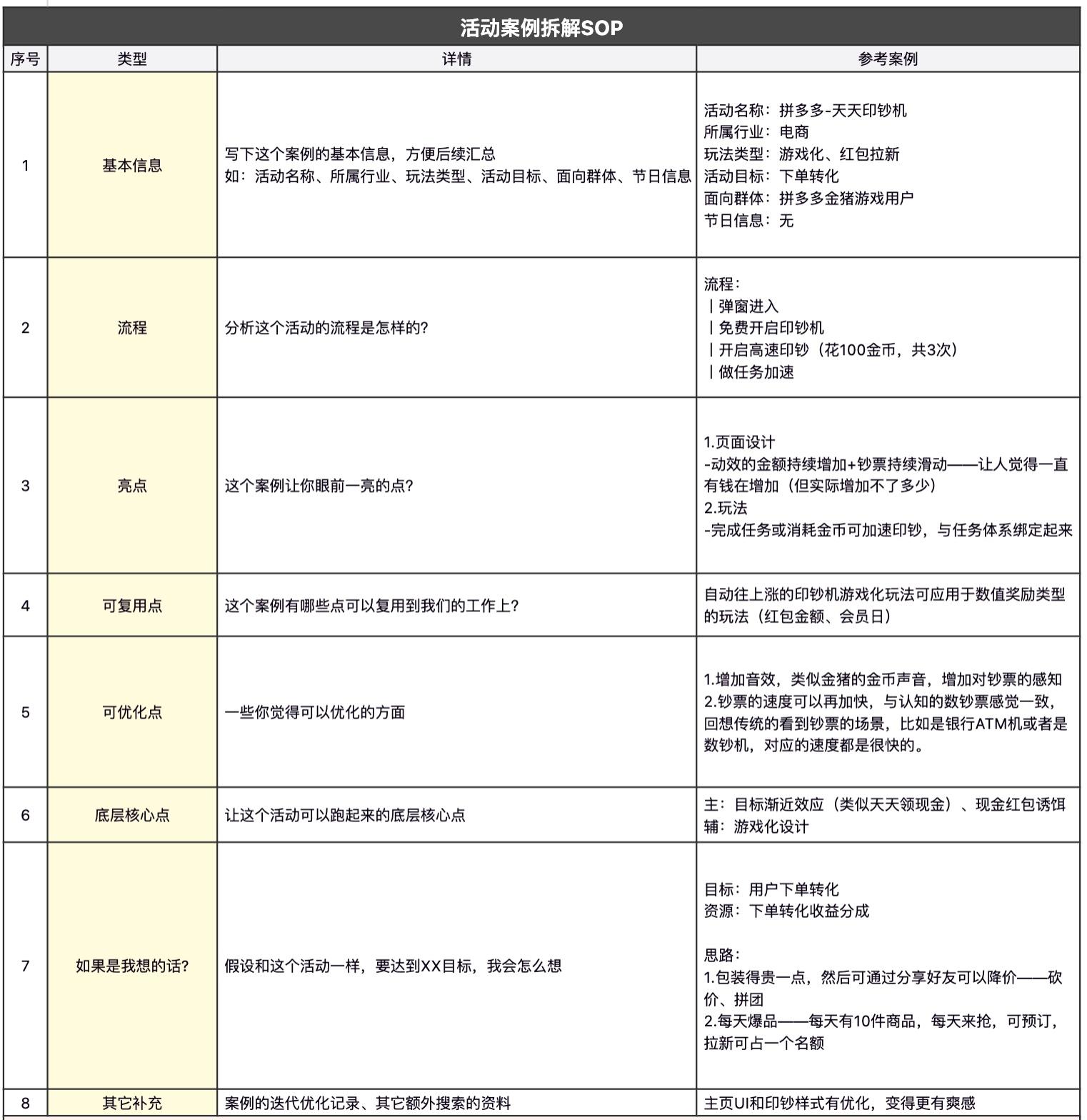 我这里分享一下个人的看法其实案例拆解的核心目标导向为:提炼案例中的亮点和不足,复用到自己的工作中。对应拆案例的核心操作其实会有2点: