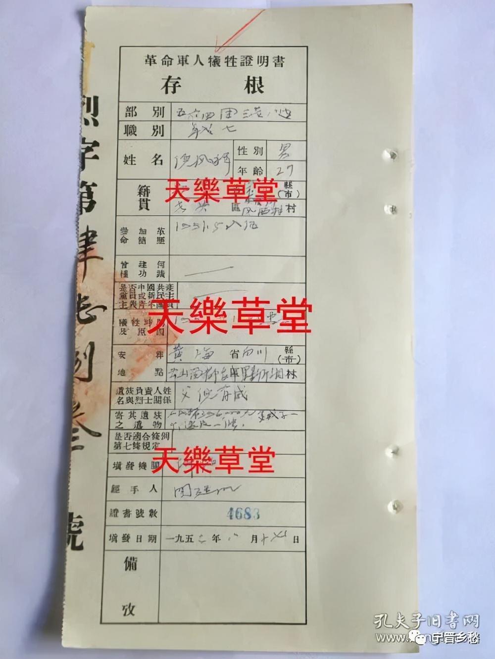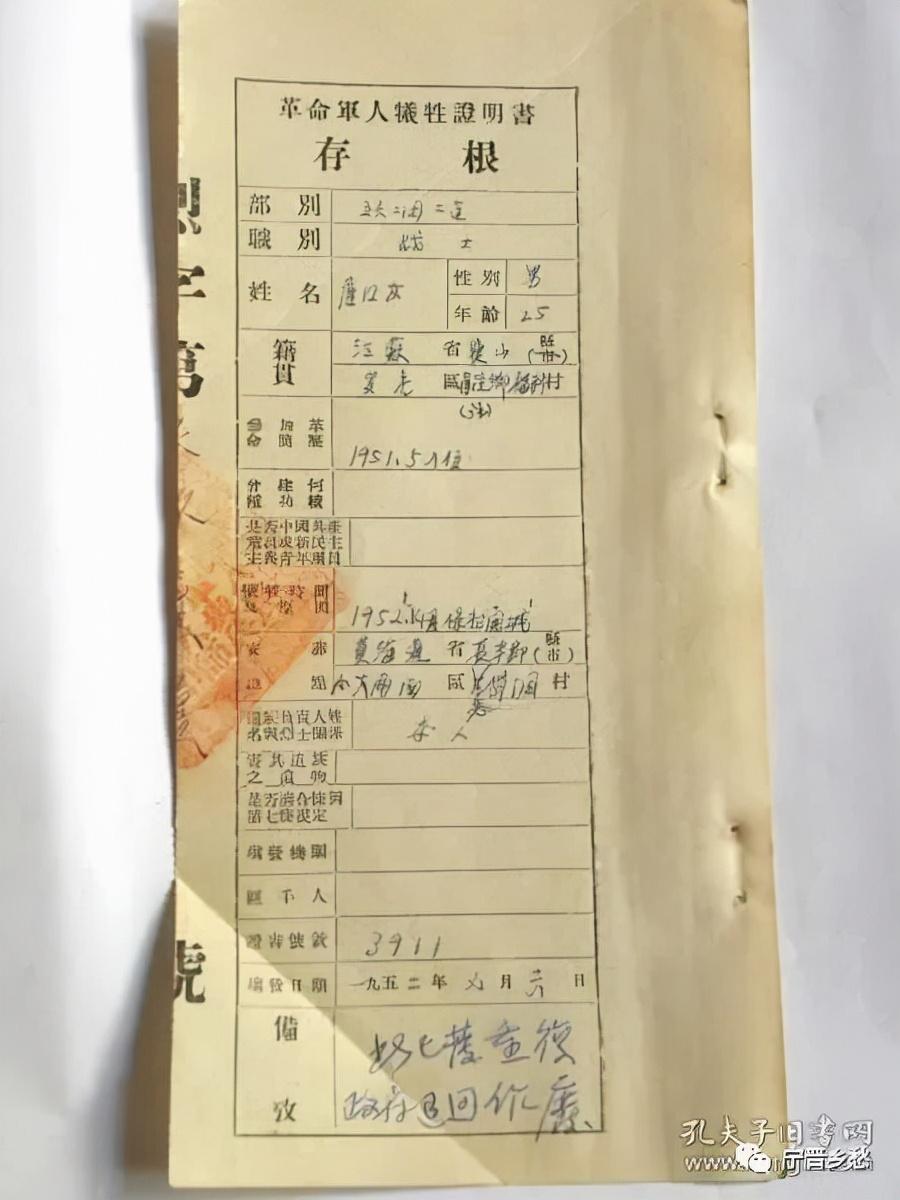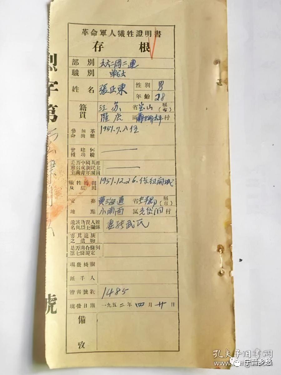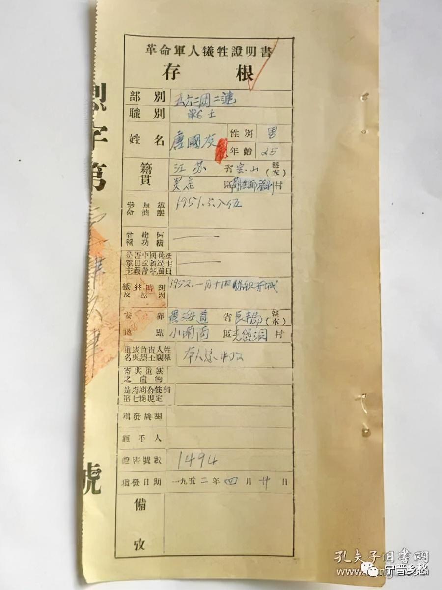 中国人民志愿军革命军人牺牲证明书存根,63军188师562团二连战士唐国友,男,25岁,宝山县罗店区肖泾乡福利村人,1951年5月入伍,1952年4月保卫开城牺牲。