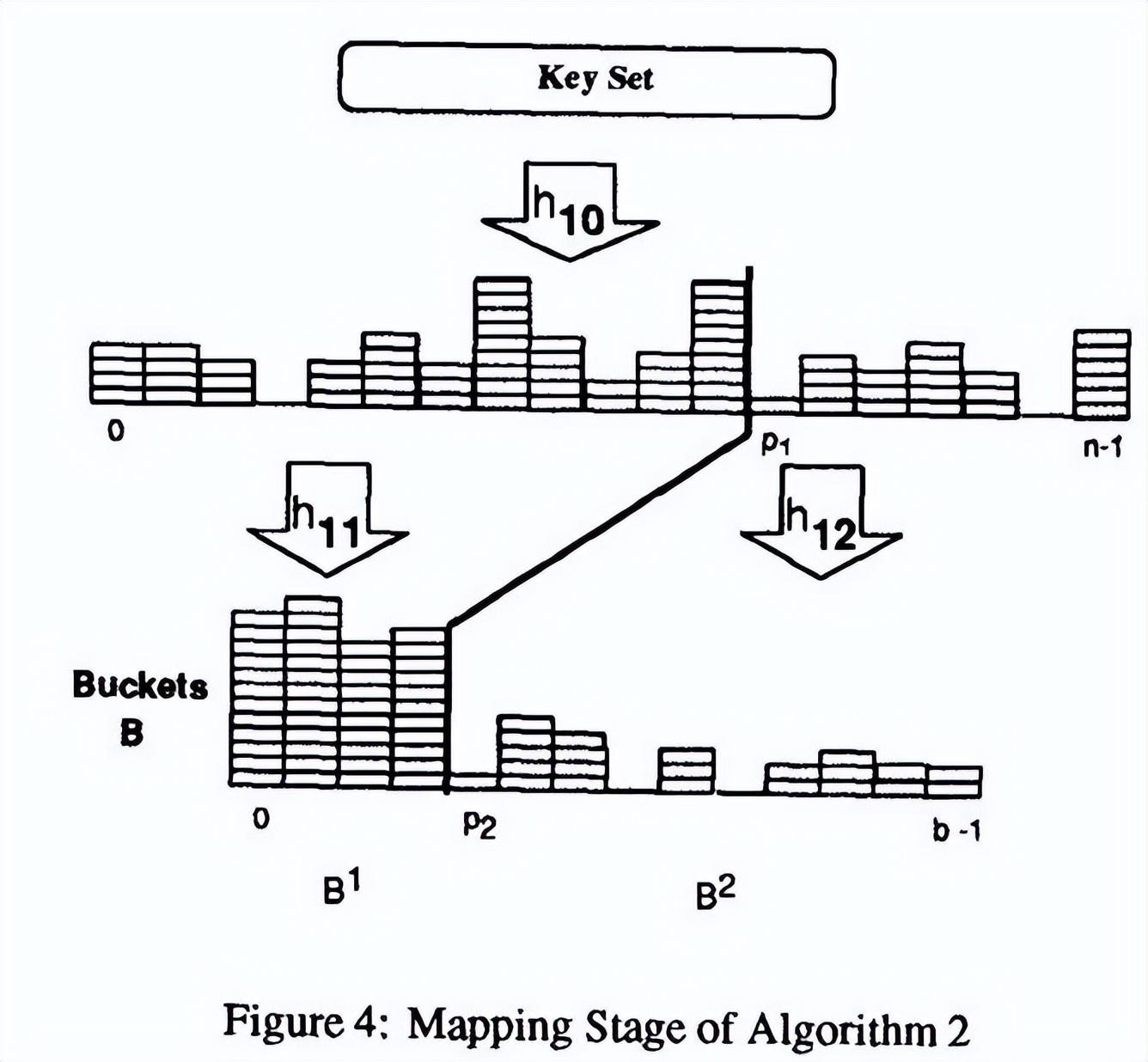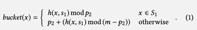 MappingMapping 阶段为了将 60% 的 key 分布到 30 % 的桶里,将 n 个 key 分为 S1 和 S2 两个集合,其中 S1 称为 dense set,key 的数量大概保持在 0.6 * n,S2 为 sparse set,key 的数量大概在 0.4 * n 左右。同时,把所有桶分为两个部分 B1 和 B2,B1 数量 p2 = 0.3 * m,称为 dense buckets,B2 数量 0.7 * m,称为 sparse bucket。使用普通的 Hash 函数如 Cityhash/MurmurHash,将 S1 通过 H1 映射到 B1 中,同样道理将 S2 通过 H2 映射到 B2 中。