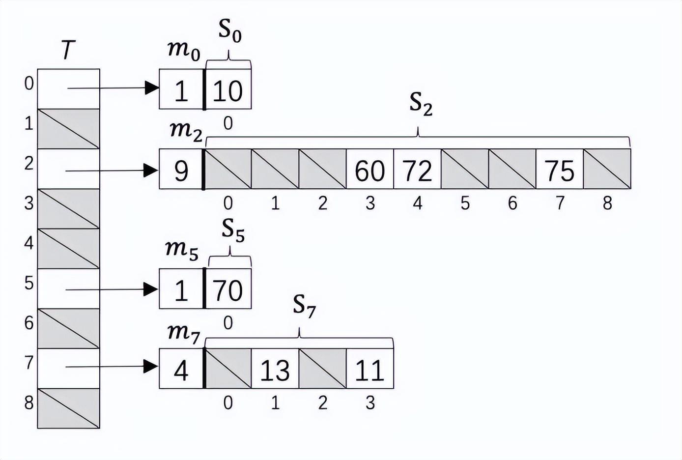 将数据通过一级 Hash 映射到 T 空间中,然后冲突的数据随机选取新的哈希函数映射到 S 空间中,且 S 空间的大小 m 是冲突数据的平方(例如 T2 中有三个数字产生冲突,则映射到 m 为 9 的 S2 空间中,m 即为避免桶内 Hash 冲突的参数),此时可以容易找到避免碰撞的哈希函数(这个避免冲突的过程称为 position 或者 displace)。最差情况下所需存储空间为 O(n2),但只要适当选择哈希函数减少一级哈希时的碰撞,则可以使预期存储空间为 O(n)。