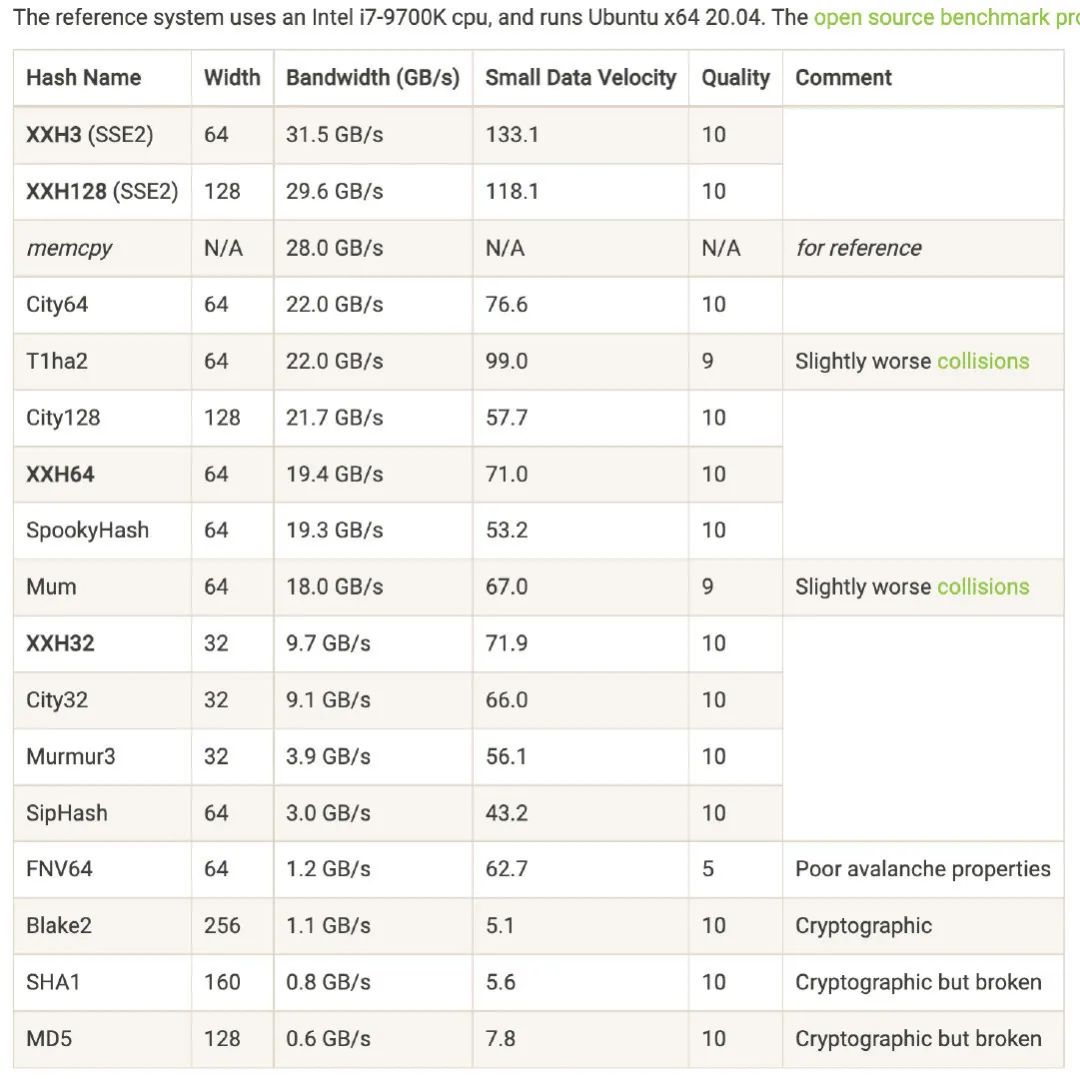 CRC32:CRC32 能够快速的生成 32 位 Hash 值,一般在数据库系统或数据传输中出现,用于快速校验数据是否完整;SipHash:SipHash 并不是为了速度设计的,与其他 Hash 函数相比速度上不占优势,而提供了 HashDoS 保护,是 Rust 中的 Hash 函数的默认实现,最新 Redis 中也在使用 SipHash;MurMurHash:经典快速的 Hash 函数,目前最新的版本是 MurMurHash3,可以生成 32 位或者 128 位 Hash 值;CityHash:来自于 Google 实现,受到 MurmurHash 启发,但是比 MurmurHash 更快,可以输出 64 位、128 位或者 256 位 Hash 值。ClickHouse 内置;xxHash:针对小数据集速度非常快,支持输出 32 位、64 位、128 位 Hash 值,Github 开源,SSE 支持。ClickHouse 内置。xxHash 的 benchmark,统计了常用 Hash 函数的性能: