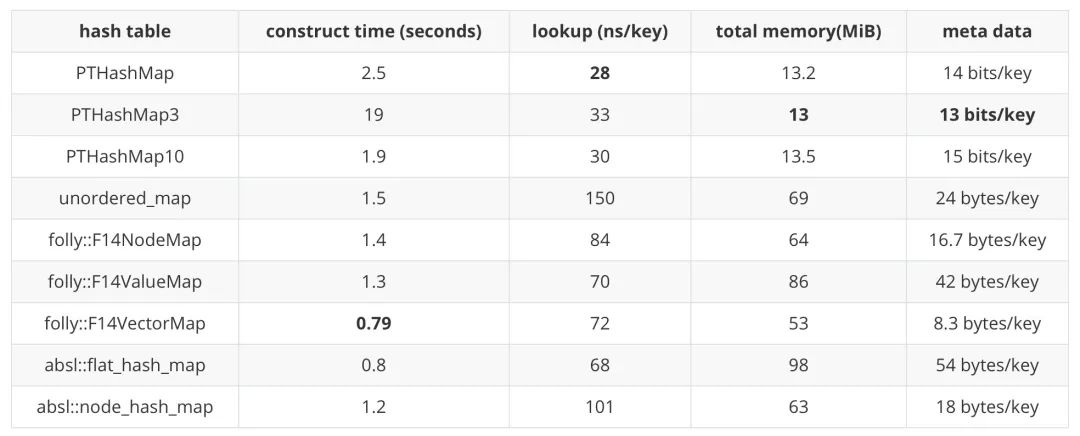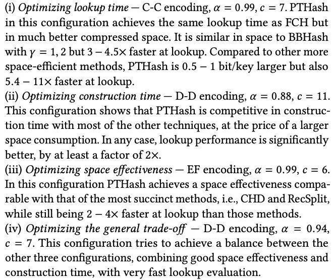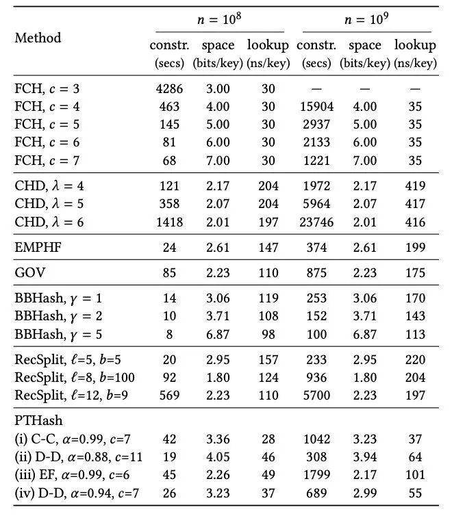 虽然 CHD 实现简单,但其中包含了大量除法求余计算,Encoding 后效率并不高,lookup 耗时过久。最近有一篇文章提出了 PTHash 方法,在 FCH 上改进了构建时间,并提高了空间利用率,作者还提供了源代码供参考。