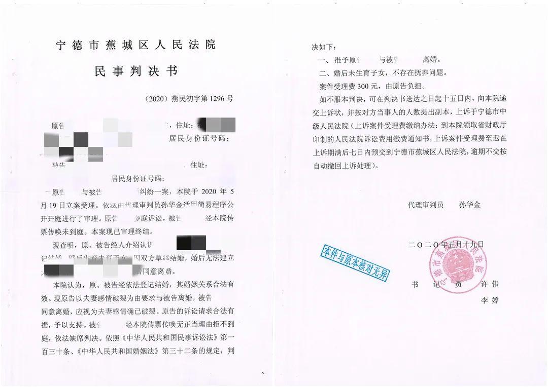 近日,蕉城法院在审理原告杨某与被告尹某某离婚纠纷一案过程中,法官在和原告杨某核对证据材料时,发现杨某携带的材料中含有一份案号为(2020)蕉民初字第1296号的民事判决书及生效证明,该份“判决书”显示,法院判决准予其与被告尹某某离婚,“生效证明”则显示该案判决已发生法律效力。承办法官发现,杨某持有的这两份法律文书,文书首部的格式、编号、审判人员的名字、法院公章等均存在明显错误。