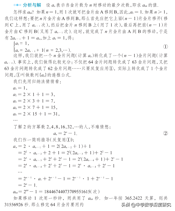 传说开天辟地的神——梵天(印度教主神)在创造世界的时候,在其中的2一根针上从下到上放置了由大到小的64片金片,这就是所谓的汉诺塔。A BC不论白天黑夜,都有一名值班的僧侣根据梵天的旨意,按照规定的方法,把这些金片在三根针上移来移去:一次只能移一片,并且要求不论在哪一根针上,小片永远在大片的上面。当所有的64片金片都从梵天创造世界时所放的那根针上移到另一根针上时,"世界末日"即到来.假设每次移动需要1秒的时间,"世界末日"何时到来?