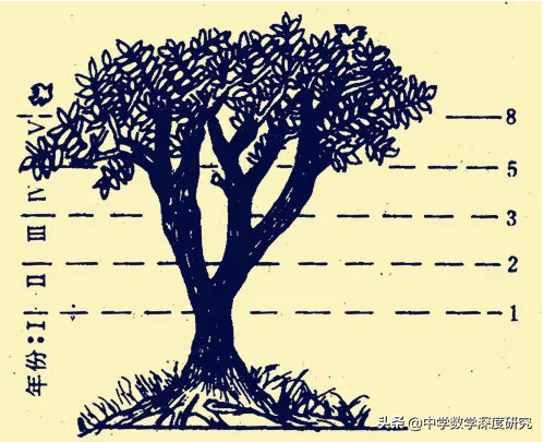 如图所示,例如,树木的生长,由于新生的枝条,往往需要一段"休息"时间,供自身生长,而后才能萌发新枝。所以,一株树苗在一段间隔,例如一年,以后长出一条新枝;第二年新枝"休息",老枝依旧萌发;此后,老枝与"休息"过一年的枝同时萌发,当年生的新枝则次年"休息"。这样,一株树木各个年份的枝桠数,便构成斐波那契数列。这个规律,就是生物学上著名的"鲁德维格定律"。