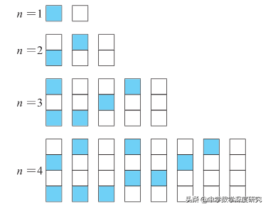 例2(湖北省高考数学试题)给n个自上而下相连的正方形涂上黑色或白色,当n≤4时,在所有不同的涂色方案中,黑色正方形互不相邻的涂色方案如下图所示: