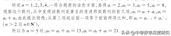 解析:问题表面上是一道"涂色问题",实质上是通过创设一个斐波那契数列的情境,考查归纳猜想和合情推理意识,通过增加新的元素,进行整合与创新。
