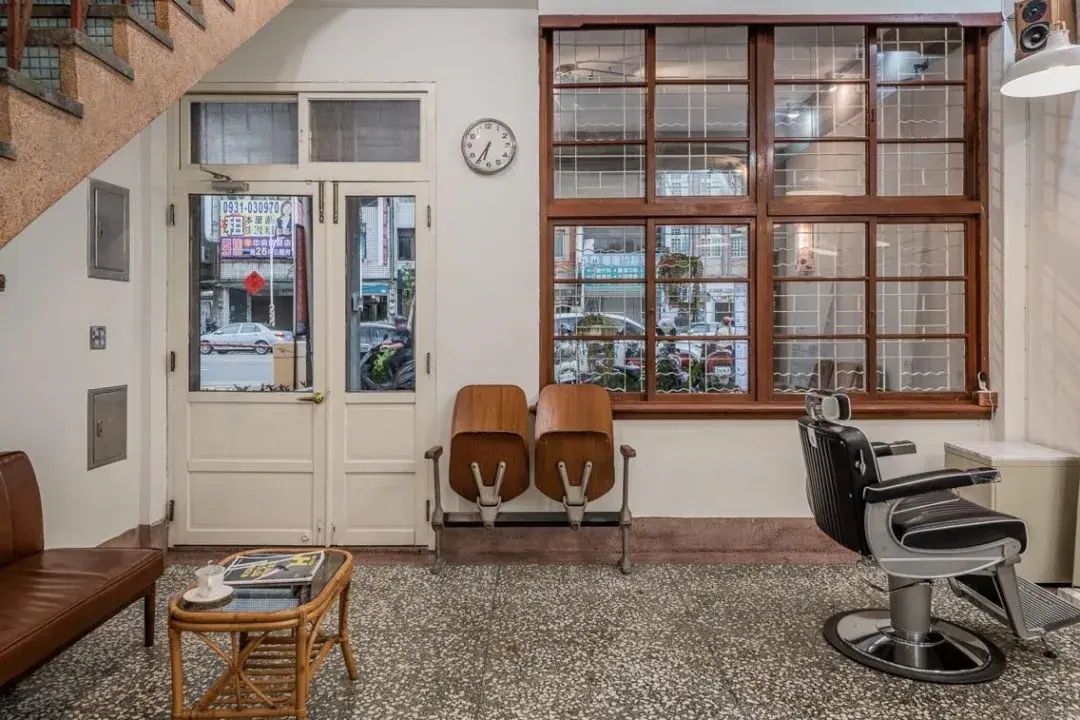此区为理发店主区域,保留的木窗框、磨石子地板,搭配复古电影椅及皮革座椅,传递浓厚的怀旧感;仅有的三个座位区搭配三面全身镜,则营造出大器又放松的气氛。客人摆放物品的收纳柜是根据过往理发店经验量身定制,不管是摆放梳妆、吹整用品,或是茶水点心都顺手便利。