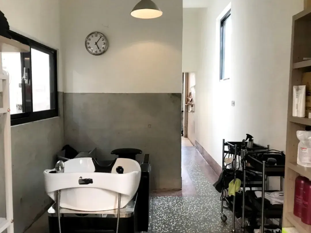 因应理发店需求,将原本的厨房格局,变更为同样需要水线的单人洗发区,角落简易的收纳架、收纳柜搭配一张长度、宽度皆恰到好处的洗发躺椅,创造洗发区独立感,完整发挥长型格局并制造不被打扰的隐密氛围。