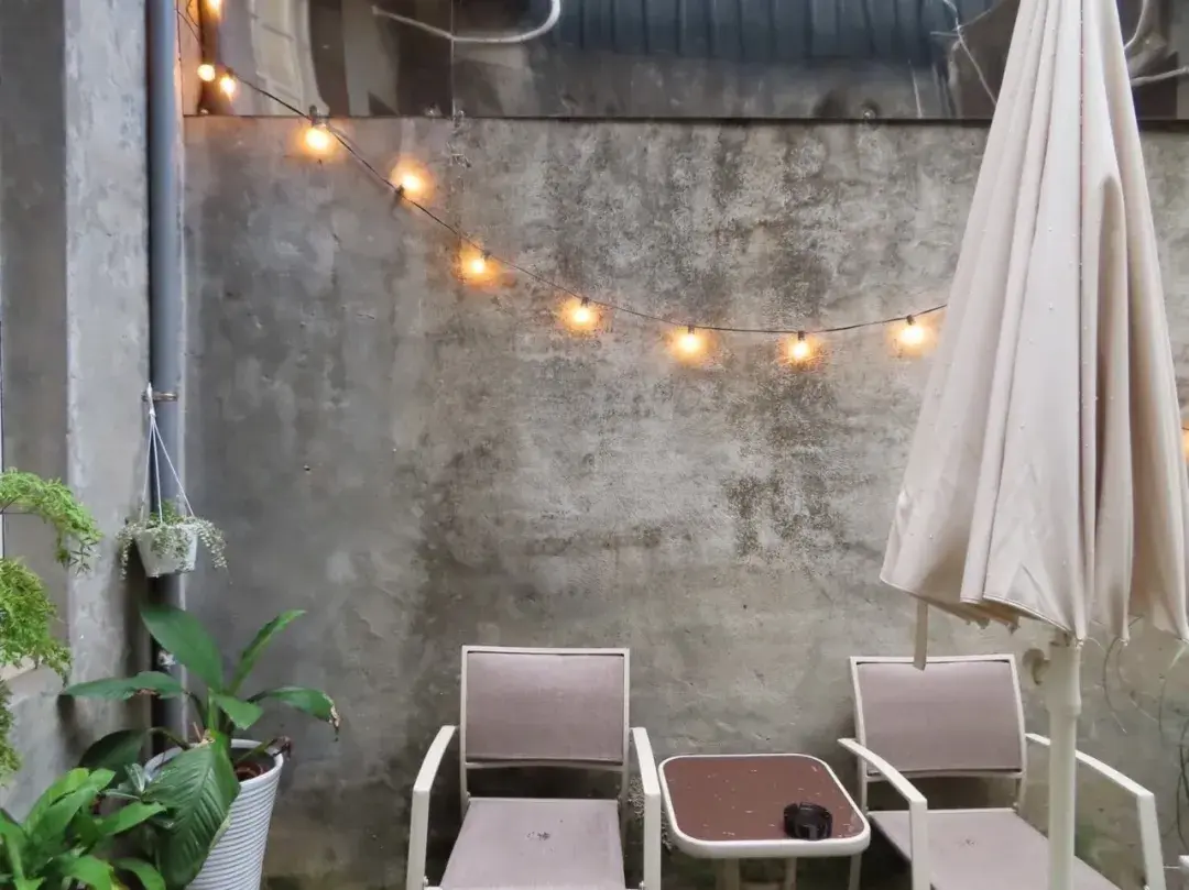 原始的天井区被水池占据,拆除水池后 Solo 顺势新增落地窗,让长型格局的前、后区互通有无,不仅多了私人小庭院,还替室内解决光线不足缺陷。而装潢上则保留原始的墙面模样,利用植栽、椅凳、装饰灯简单布置,极呈现出简单不造作的放松氛围。