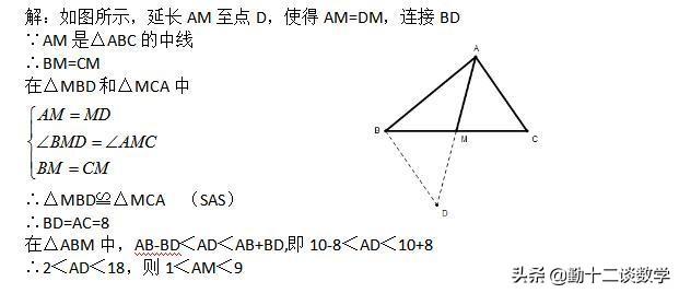 分析:典型的倍长中线法,可延长中线AM到点D,使得AM=MD,连接BD,构造出全等三角形,然后利用三角形三边之间的关系求出中线AM的取值范围。