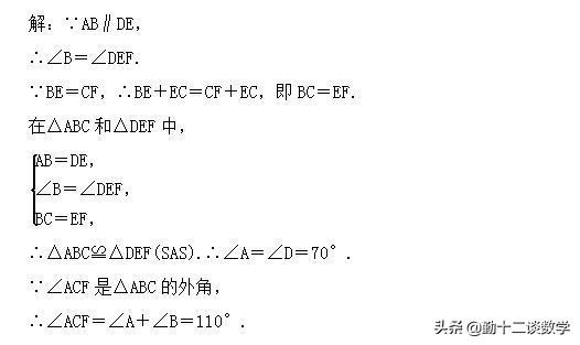 分析,通过“AB∥DE”可知,∠B=∠DEF,再加上“AB=DE,BE=CF”,可通过SAS证明△ABC≌△DEF。全等三角形的对应角相等,得到∠A=∠D=70°,∠ACF是△ABC的外角,外角等于两个不相邻的内角和。