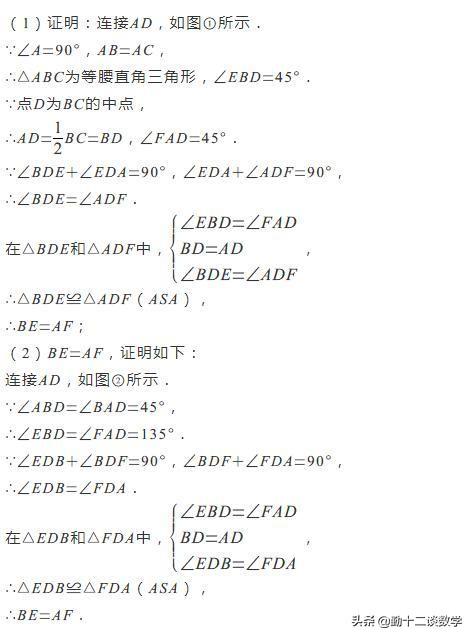 分析:第1小问是典型的等腰直角三角形中的模型,这个模型的应用也很广泛,需要了解整个模型的变化,由角的边、由边的角的证明方法类似。连接AD,根据等腰三角形的性质可得出AD=BD、∠EBD=∠FAD,根据同角的余角相等可得出∠BDE=∠ADF,由此即可证出△BDE≌△ADF(ASA),再根据全等三角形的性质即可证出BE=AF。