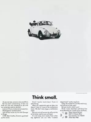 他们对广告进行了补隙定位,其广告是这样设计的:左上角一辆小车,中间大片空白,下面一小段说明文字,标题为“想想还是小的好”。