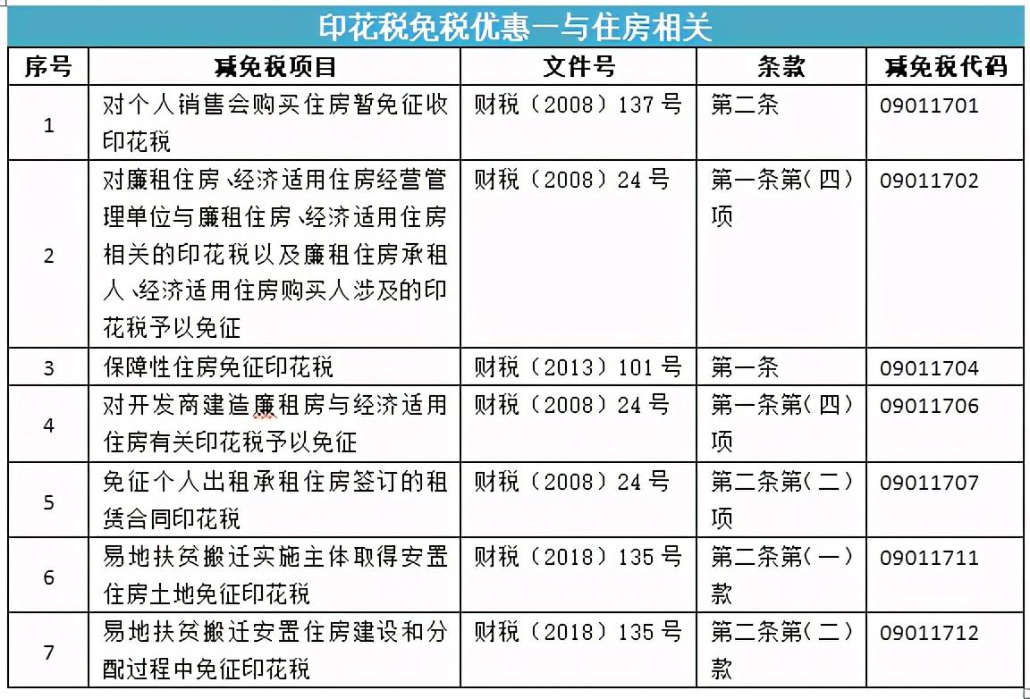 第五类,与住房相关的优惠,一共有12项。最常用的应该是个人销售或购买住房免印花税。其他免征基本和廉租房、保障房、公租房相关,另外高校学生公寓租赁合同也免税。