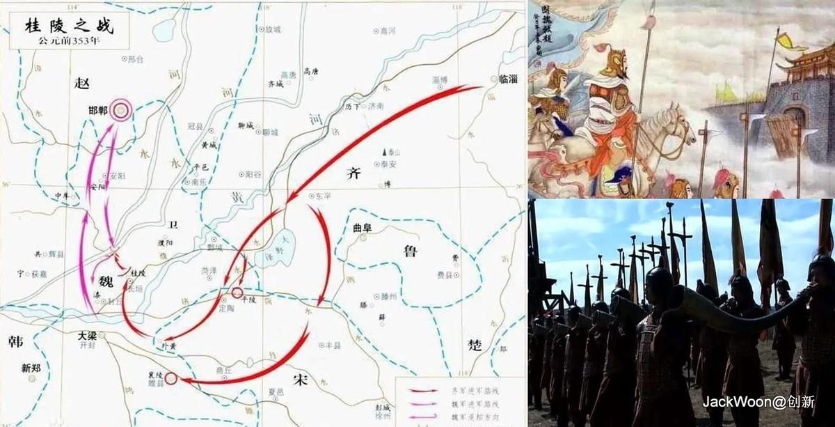 齐王命令田忌、孙膑带兵去救赵国。孙膑考虑到魏国的精锐部队出征在赵国,内部空虚,就带兵攻打魏国本土,迫使魏国把军队撤回,趁魏军回师疲惫,在中途予以截击,把魏军打得大败,从而解了邯郸之围,救了赵国。