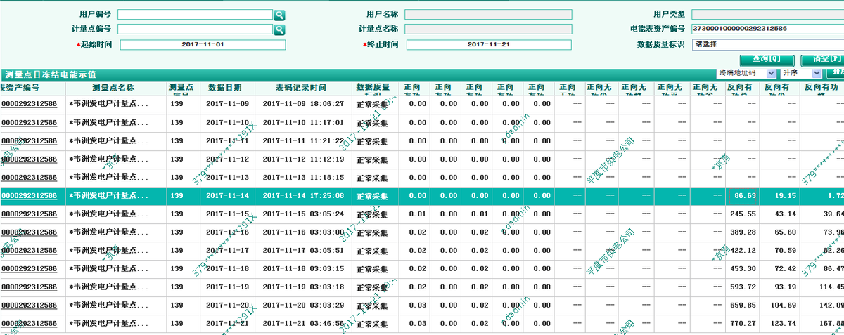该台区月度线损率是负数,检查总表电量时,发现11月9日新上的光伏发电耿韦洲的电量未计算在总电量中,遂检查该表自安装之日起的反向表码采集情况,发现该表在11月14日之前的反向采集表码均是异常数据,导致月度电量无法正常计算。