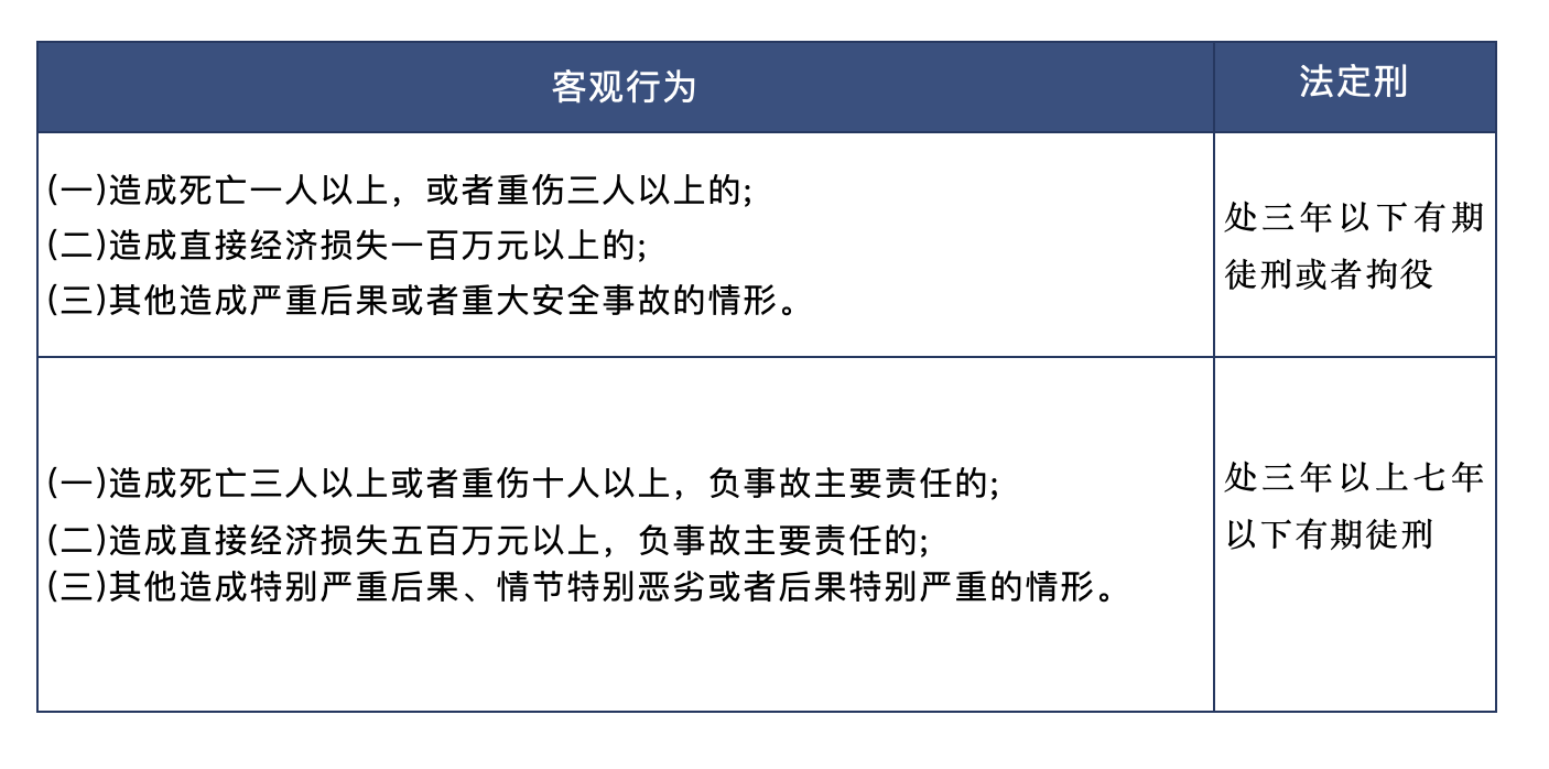 【重大责任事故罪】在生产、作业中违反有关安全管理的规定,因而发生重大伤亡事故或者造成其他严重后果的,处三年以下有期徒刑或者拘役;情节特别恶劣的,处三年以上七年以下有期徒刑。