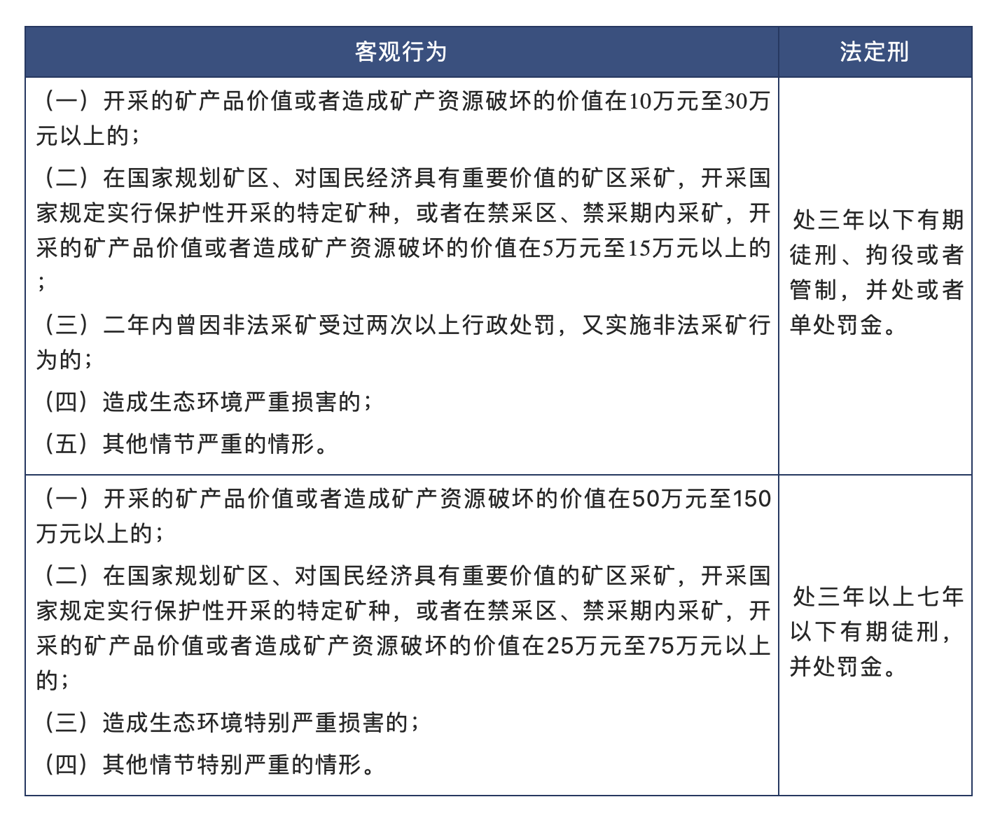 【非法采矿罪】违反矿产资源法的规定,未取得采矿许可证擅自采矿,擅自进入国家规划矿区、对国民经济具有重要价值的矿区和他人矿区范围采矿,或者擅自开采国家规定实行保护性开采的特定矿种,情节严重的,处三年以下有期徒刑、拘役或者管制,并处或者单处罚金;情节特别严重的,处三年以上七年以下有期徒刑,并处罚金。