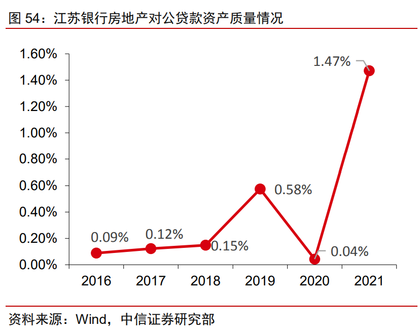 增量贷款不良率走势良好。本报告第三部分分析过江苏银行 2021 年对公增量贷款重 点在基建类、制造业,零售增量贷款重点在个人消费贷款和住房按揭贷款。从江苏银行不 良率分类来看,对公端,增量较多的基建类和制造业贷款不良率都在 2021 年显著改善, 其中基建类贷款不良率同比下降 0.44pct,制造业贷款不良率同比下降 1.79pcts,而不良 率出现波动的房地产业、建筑业并不是主要增量方向;零售端,江苏银行除个人经营性贷 款外的零售贷款不良率长期保持较低水平,2021 年不良率为 0.70%,而不良率相对较高 的个人经营性贷款也并不是江苏银行的主要增量方向。整体看,江苏银行主要贷款增量方 向上不良率走势向好,有利于资产质量进一步改善。
