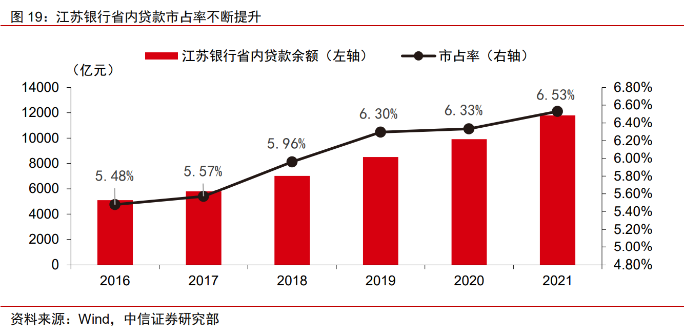 江苏银行是江苏省本土最大的法人银行。江苏省金融资源富集,上市银行相对较多, 目前共有本土上市城商行 3 家,分别为江苏银行、南京银行和苏州银行,此外还有上市农 商行 6 家。江苏银行资产规模、营收和利润、分支机构数量等方面均领先于省内其他银行。 截至 2021 年末,江苏银行在省内拥有 460 家分支机构,超过南京银行(171 家)和苏州 银行(167 家)。 江苏银行本地市场份额处于领先地位。从贷款省内市场份额来看,截至 2021 年末, 江苏银行、南京银行、苏州银行的贷款市占率分别为 6.53%、3.60%和 1.18%,江苏银行 具有明显优势。自2016年末至2021年末,江苏银行省内贷款市占率从5.48%上升至6.53%, 市场份额稳步上升。另外据江苏银行财报披露,截至 2021 年底,江苏银行服务小微、科 创企业的户数和贷款余额在江苏省内持续保持第一位。
