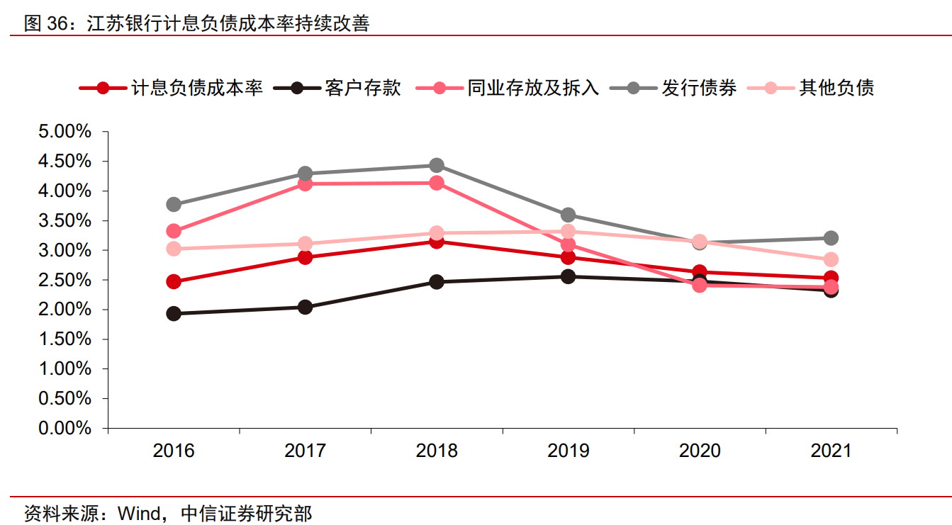 计息负债结构和存款成本率仍有改善空间。尽管在 2018 年以来持续改善,2021 年江 苏银行计息负债成本率仅位于上市城商行第十一位,仍有较大改善空间。计息负债结构中存款占比仍待提高。截至 2021 年末,江苏银行存款占计息负债比重 为 62.0%,在 16 家上市城商行中排第 13 位,低于上市城商行平均值(66.2%),存款占 比仍有提升空间。2022 年江苏银行继续着力拓客强基,积极拓展存款,有望逐步提升存 款在计息负债结构中的占比。存款成本率仍待改善。截至 2021 年末,江苏银行存款成本率为 2.32%,在 16 家上 市城商行中排第七高,高于上市城商行平均值(2.30%)。