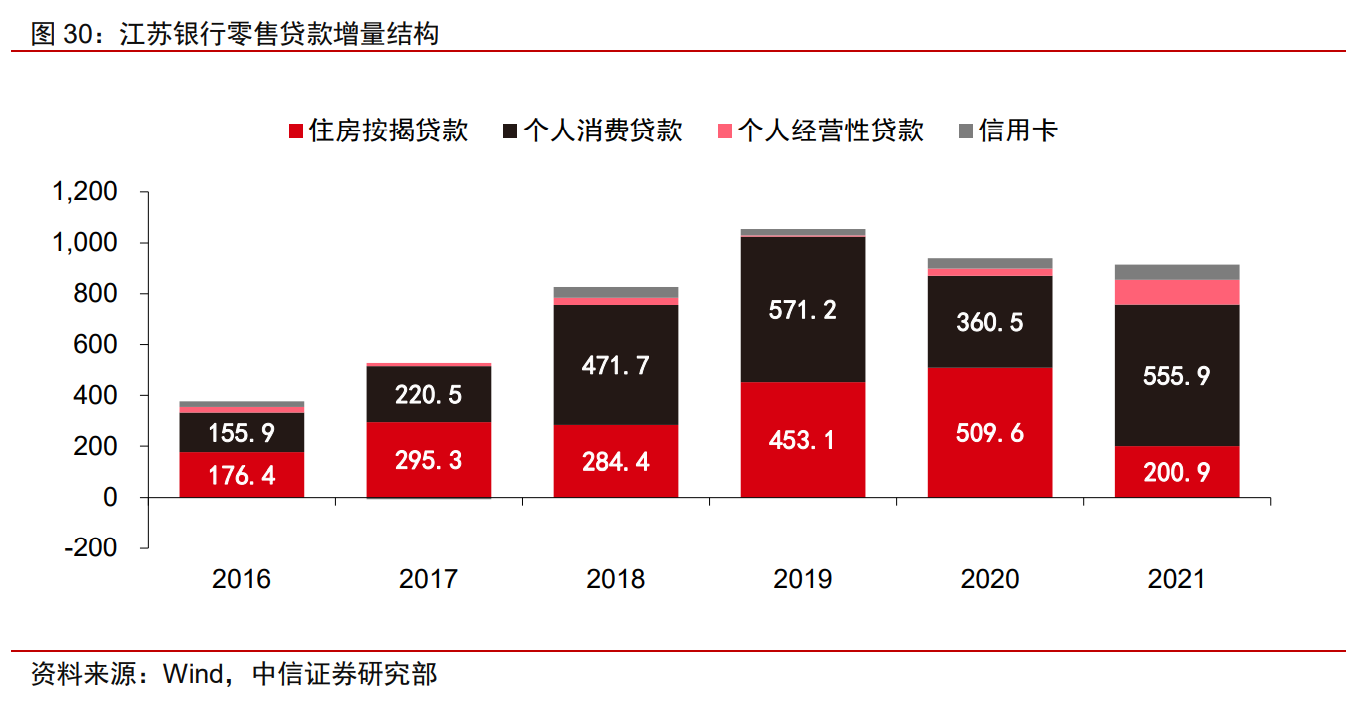 个人消费贷款和住房按揭贷款贡献零售贷款主要增量。江苏银行零售贷款增量结构中, 个人消费贷款和住房按揭贷款长期贡献主要增量,2016-2021 年六年间,两类贷款合计占 总零售贷款增量超 90%,其中 2021 年之前两类贷款累计增量基本相当,2021 年个人消费 贷款增量占比大幅提升,贡献占比超 60%。