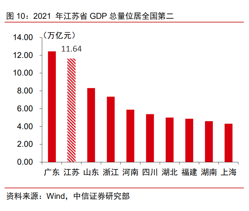 江苏经济总量与人均 GDP 均位于全国前列。2021 年,江苏省实现 GDP 总额 11.64 万亿元,仅次于广东省;2021 年全省人均 GDP 达 13.7 万元,仅次于北京与上海两个直辖市。同时江苏省各市协同发展,全省 13 个市全部入围全国 GDP 百强城市,其中有 4 个 城市(苏州、南京、无锡、南通)的 GDP 超过 1 万亿元。动态来看,江苏省 GDP 总量 在高基数的基础上,增速仍能长期超过全国总体水平。2020-2021 年在疫情影响下,江苏 省实现两年平均 GDP 增速 6.1%,高于全国总体水平的 5.2%,经济增长动能修复优于全 国,地区经济发展优势显著。(报告来源:未来智库)