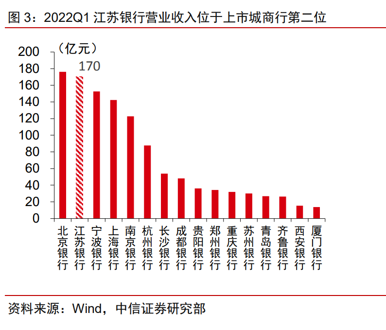 经营概况:业绩增速行业领先 江苏银行是国内头部城商行。截至 2022Q1 末,江苏银行总资产规模已达 2.76 万亿 元,位于 A 股上市城商行第二位,此外营业收入、归母净利润、存款总额、贷款总额均位 于 A 股上市城商行第二位。(报告来源:未来智库)