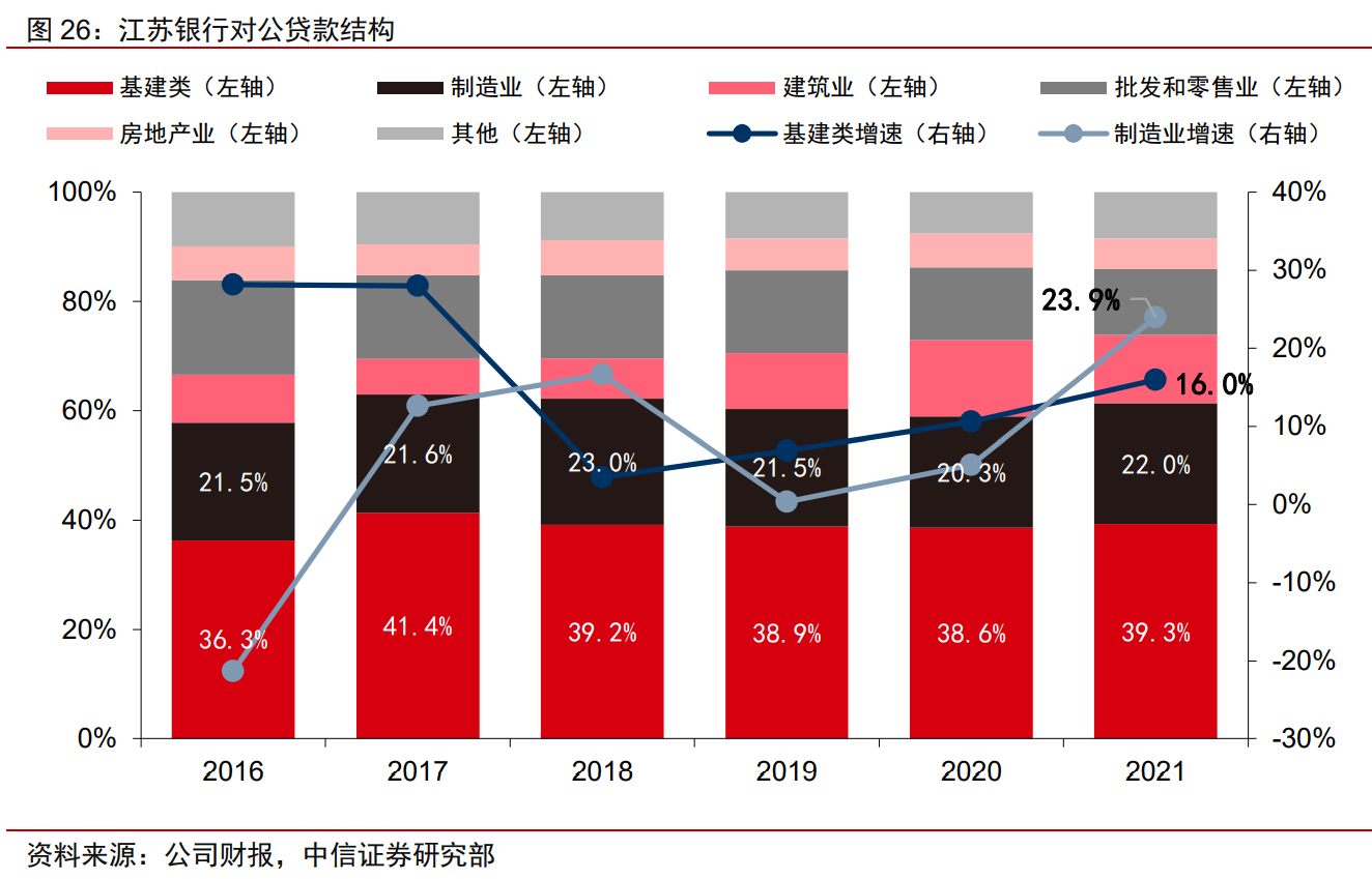 基建类、制造业贷款占比较高。江苏银行对公贷款结构中,基建类与制造业贷款持续 保持较高占比,2017 年以来合计占比长期超 60%,江苏银行充分发挥所在区域基建大省、 制造业强省的禀赋优势,聚焦先进制造业、基建产业等重点领域,打造对公贷款基本盘。 2021 年江苏银行基建类与制造业贷款同比增速分别为 16.0%/23.9%,规模积极扩张。