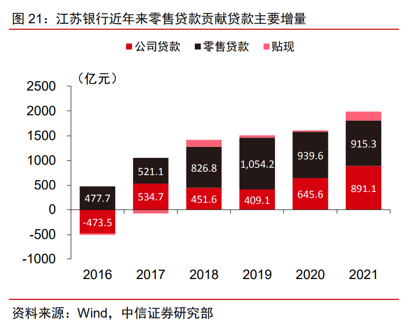 江苏银行近年来贷款规模保持较快增速。2017 年至今,江苏银行总贷款规模持续保 持超过 15%的年化增长率,2021 年贷款总额同比+16.5%,在全年实体信贷需求较弱的背 景下,体现公司较强的信贷资产获取能力。 拆分来看,江苏银行零售贷款增速较快,2016 年以来零售贷款持续保持 20%以上的 增速,而公司贷款增速相对平稳。近年来零售贷款贡献贷款主要增量,2018 年以来,每 年零售贷款增量持续高于公司贷款增量,2018-2021 年四年间,零售贷款净增量超过公司 贷款净增量的 1.5 倍,占贷款总增量的 57.2%,零售战略转型推进成效显著。(报告来源:未来智库)