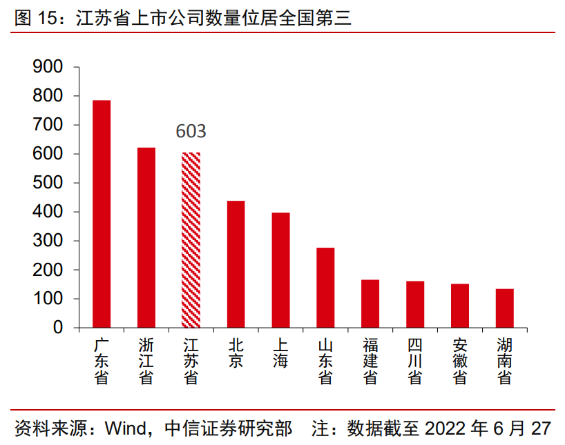 江苏省上市公司数量全国第三,科创版上市公司数量全国第一。江苏省上市公司资源 丰富,截至 2022 年 6 月 27 日,江苏省 A 股上市公司数量 603 家,位居全国第三,仅次 于广东省和浙江省。按中信证券行业分类,在机械、基础化工、电力设备及新能源、电子、 汽车、医药等行业上市公司较多。江苏省大力发展高技术产业,截至 2022 年 6 月 27 日, 科创版上市公司数量 82 家,位居全国第一。富集的上市公司资源,为当地银行对公业务、 投行业务的开展提供了基础资源。