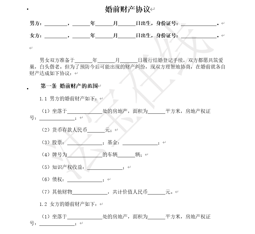 详细模板可关注wx公众号”法宝在线“,后台回复”婚前财产协议“,即可获取!!!
