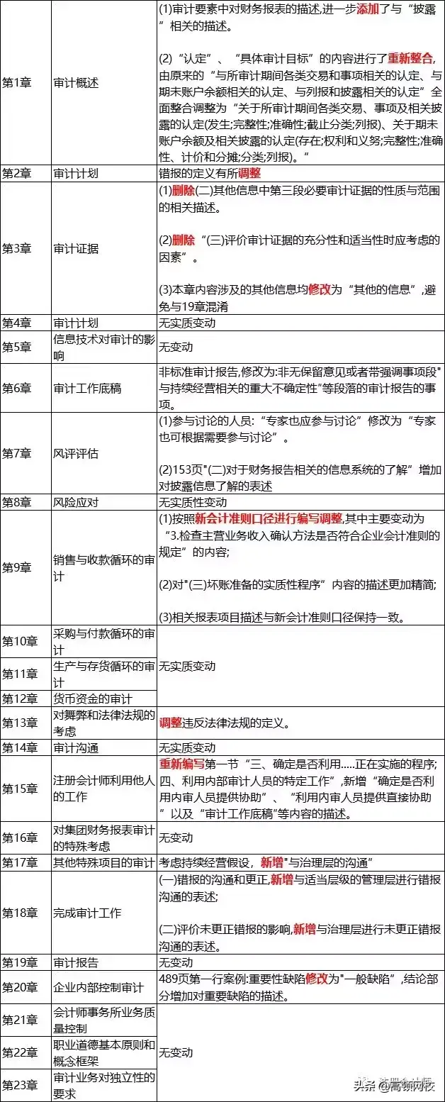 点评:2019年注会审计新教材减少了16页,但增加了1万字。教材变动主要是细节性内容的调整“比如,第1章 审计概述,将三类认定调整为两类”;第15章 注册会计师利用他人的工作,结合新审计准则的规定,对原有内容进行补充,这些新增知识是今年考试中要特别关注的,对备考有较大影响。