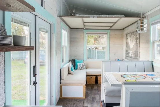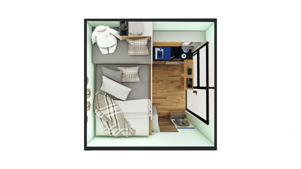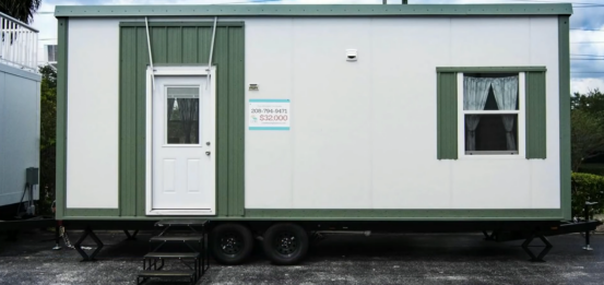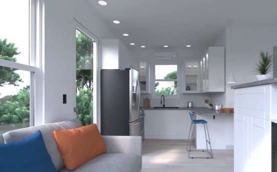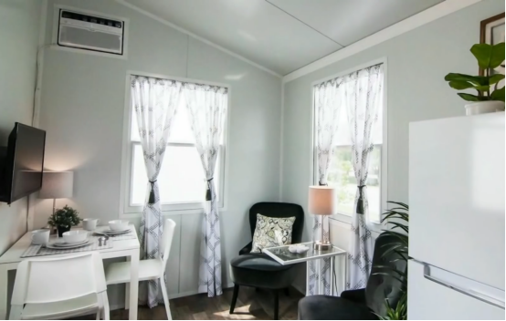 Core Housing的主要房屋是拖车房屋,房屋建造在平板拖车的上方,房屋板材采用复合彩钢板进行建造,整体形状为长方形,屋面为单坡屋面,像一个坡屋面的集装箱房,坡屋面额外多出来的区域做了吊挂式的床。这款房屋主要面向低收入人群,单个房屋约为3.2万美金一套,包含一个卧室,一客厅和一个卫生间。